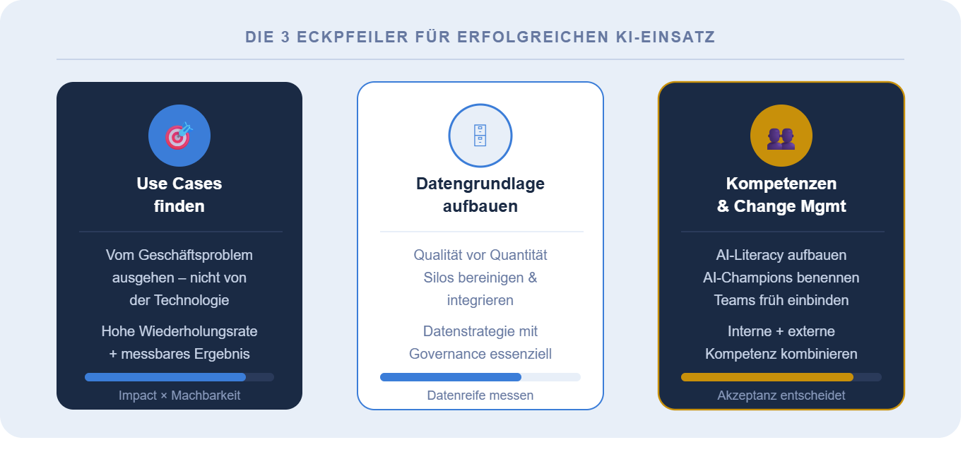 Eine erfolgreiche Umsetzung hängt nicht von Tools ab, sondern von klaren Grundlagen. Drei Faktoren entscheiden, ob Initiativen echten Mehrwert liefern oder im Pilot stecken bleiben.