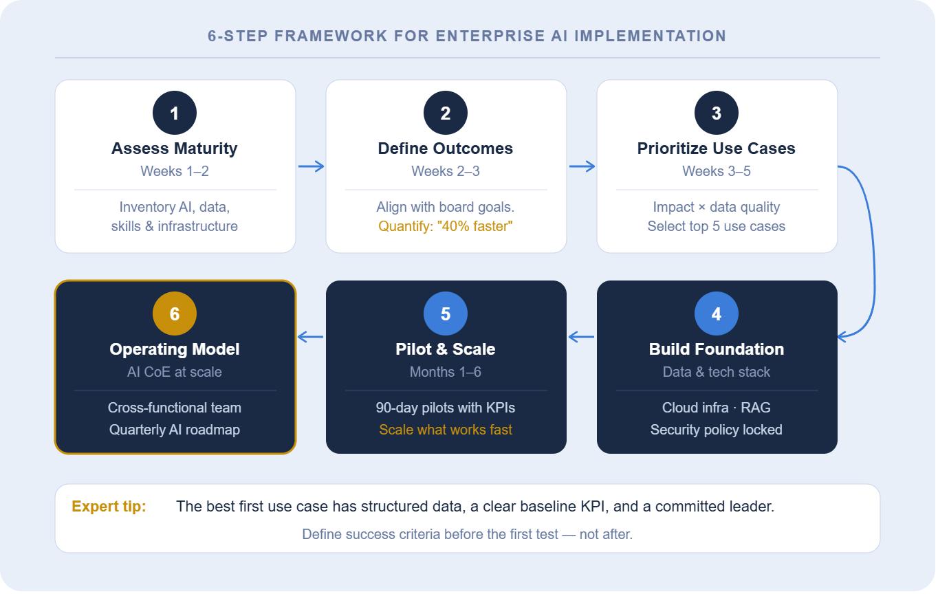 Expert tip: Before choosing any tool or model, define the outcome first. Revenue lift? Cost reduction? Risk mitigation? The answer shapes everything else.